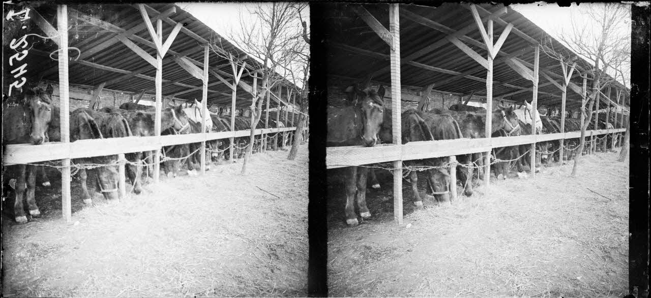 Environs de Verdun, La Falouse, Meuse. Chevaux d'artillerie parqués sur les bords de la Meuse. [légende d'origine]