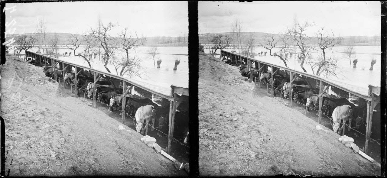 Environs de Verdun, La Falouse, Meuse. Chevaux d'artillerie parqués sur les bords de la Meuse. [légende d'origine]
