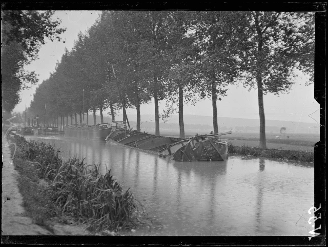 Environs de Verdun (Meuse), canal de la Meuse, péniches coulées. [légende d'origine]