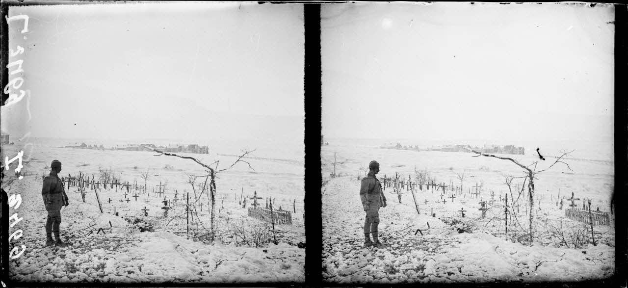 - Sur la route de Souville à Verdun (Meuse, 23/03/1917, L 2463 et L 2469) un réservoir d'eau a été détruit, alors qu'un cimetière militaire est sous la neige.