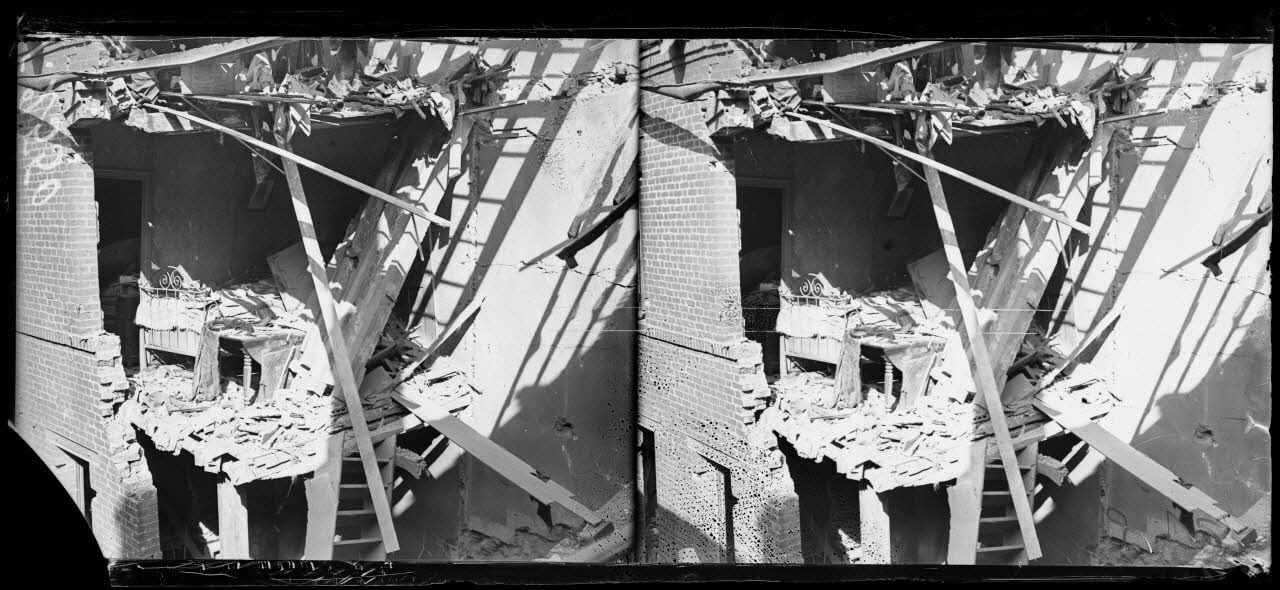 - A Epernay, (Marne, 13/03/1918, V 2545 à V 2553) le presbytère de l'église Saint-Pierre et des habitations ont été touchés lors d'un bombardement aérien. Un soldat est pris en portrait pour des photos d'identité (V 2551 à V 2553).