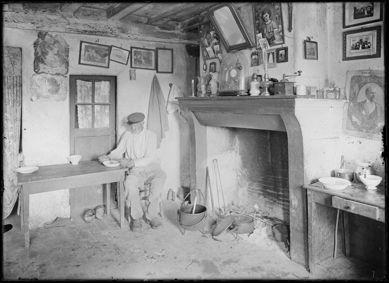 Un vieil homme prend son repas dans sa maison. Un portrait de Raymond Poincaré est affiché au mur.