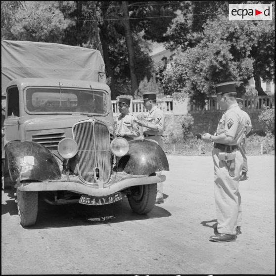 Circulation par les gendarmes du 1e escadron de la 6e légion de gendarmerie mobile au poste routier de Kerrata.