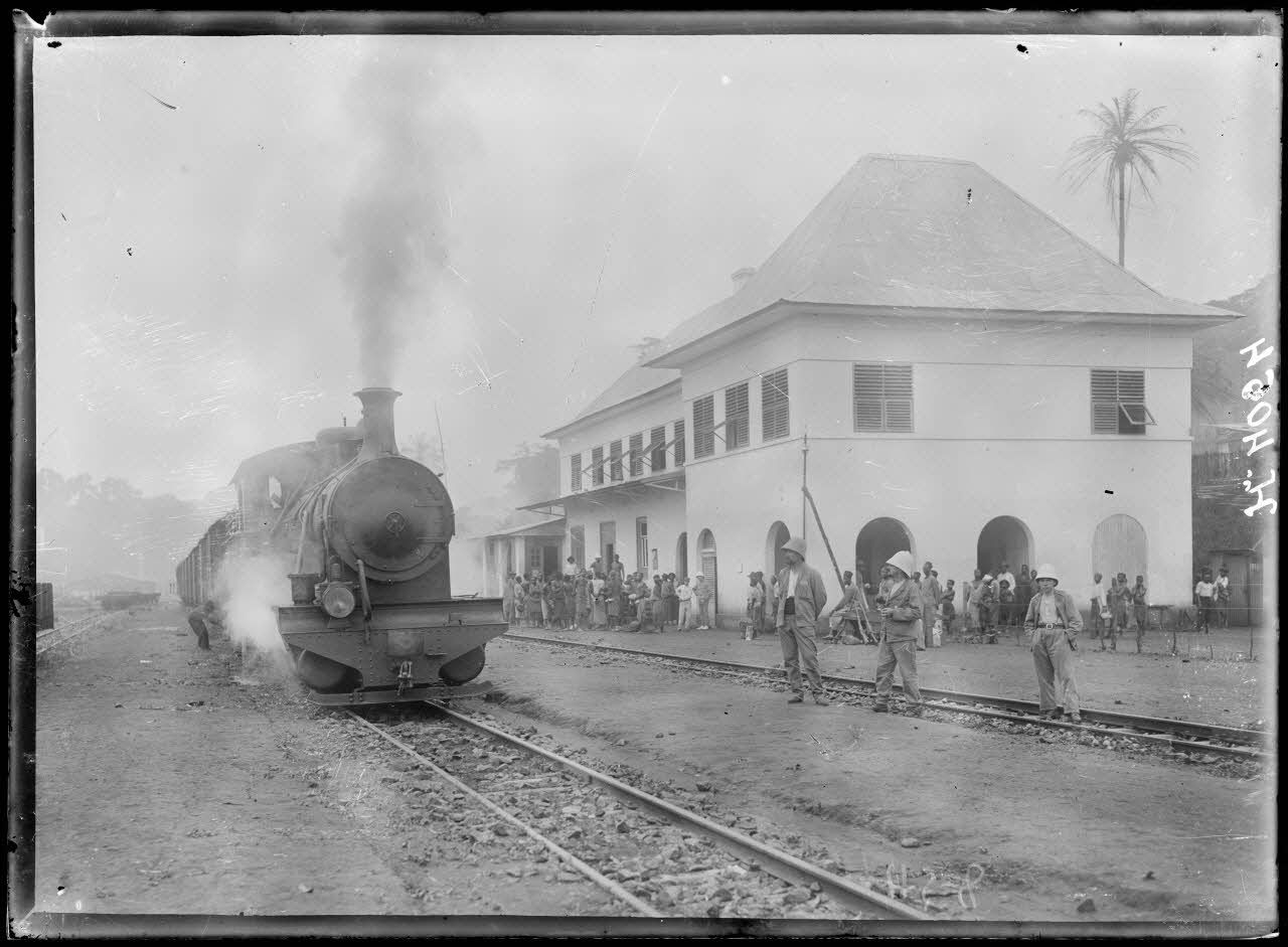 A la gare d'Eséka, des employés du chemin de fer stationnant sur une voie assistent au départ d'un train. Des tirailleurs et des indigènes se trouvent sur le quai.