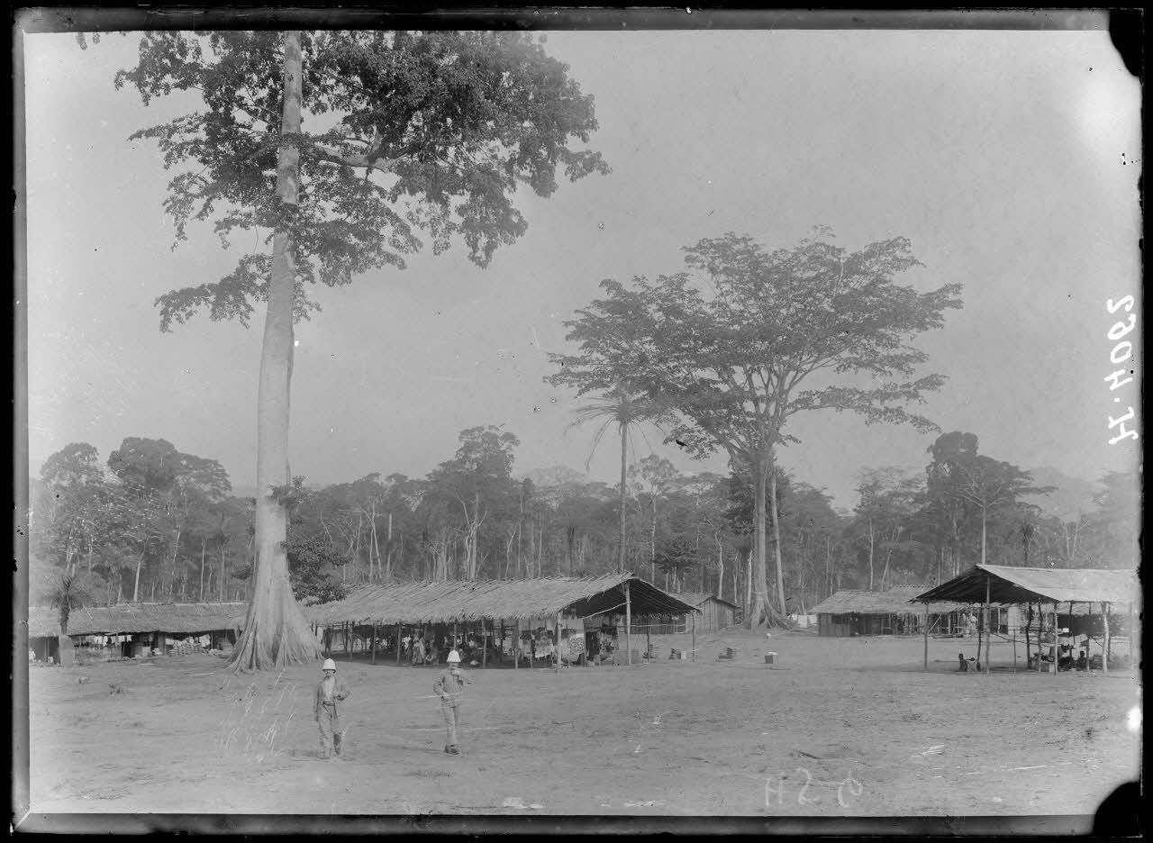 A Eseka, des baraquements et des auvents couverts de palmes sont en construction sous des arbres majestueux.