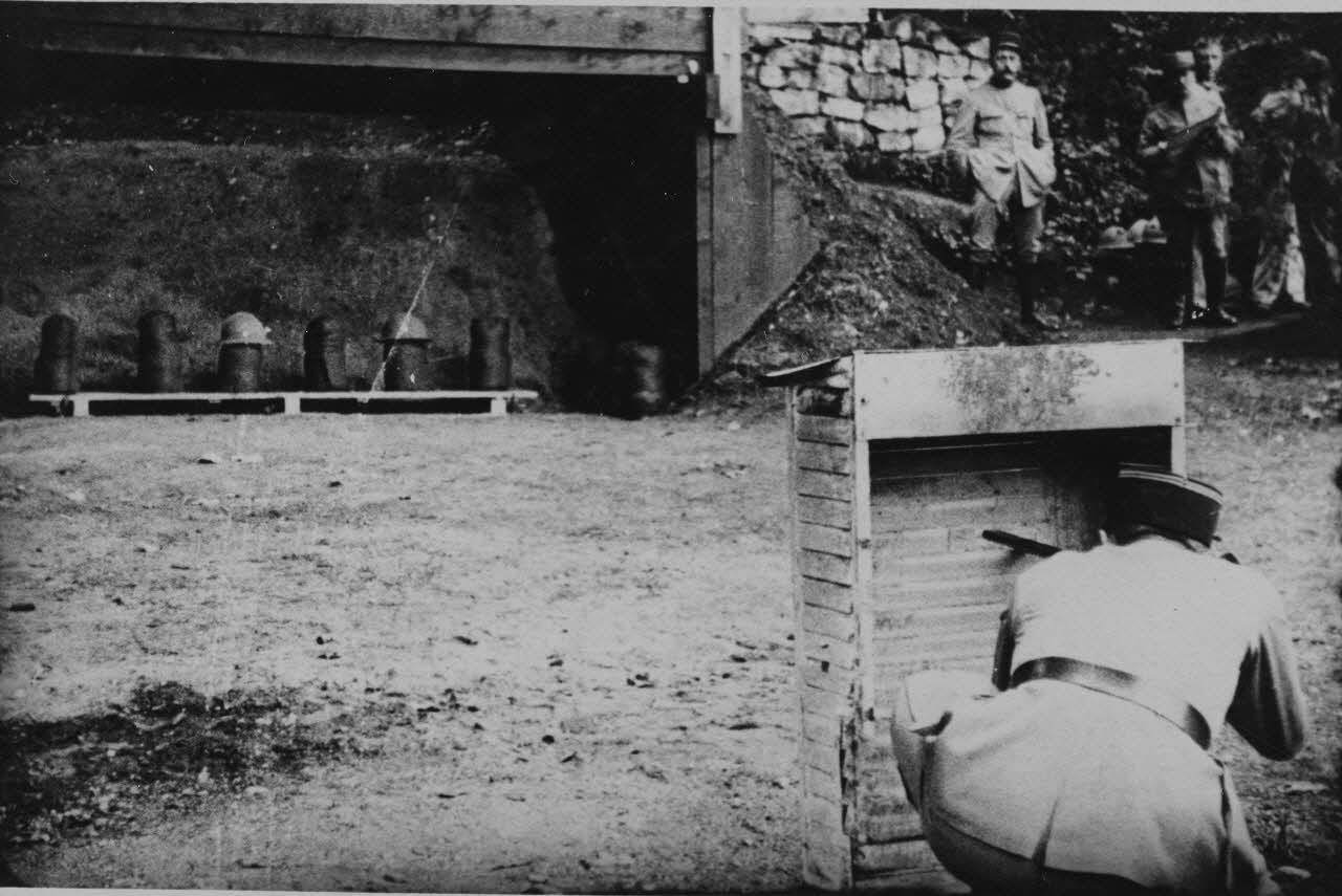 Démonstration de la résistance aux tirs d'un casque Adrian face aux autres moyens de protection proposés au début de la guerre.