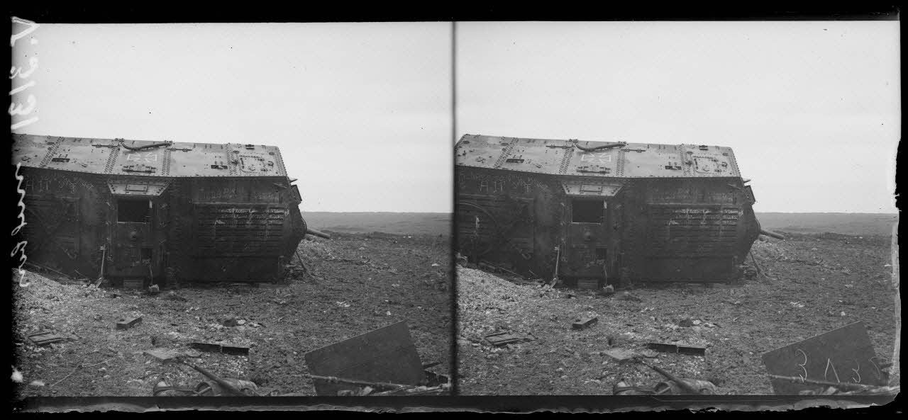 Est de Villers-Bretonneux, Somme, tank allemand renversé dans une carrière, balles perforantes françaises ayant traversé les aillières.