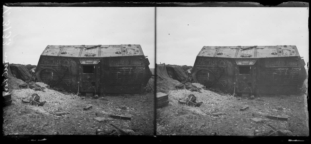 Est de Villers-Bretonneux, Somme, tank allemand renversé dans une carrière, balles perforantes françaises ayant traversé les aillières. [légende d'origine]