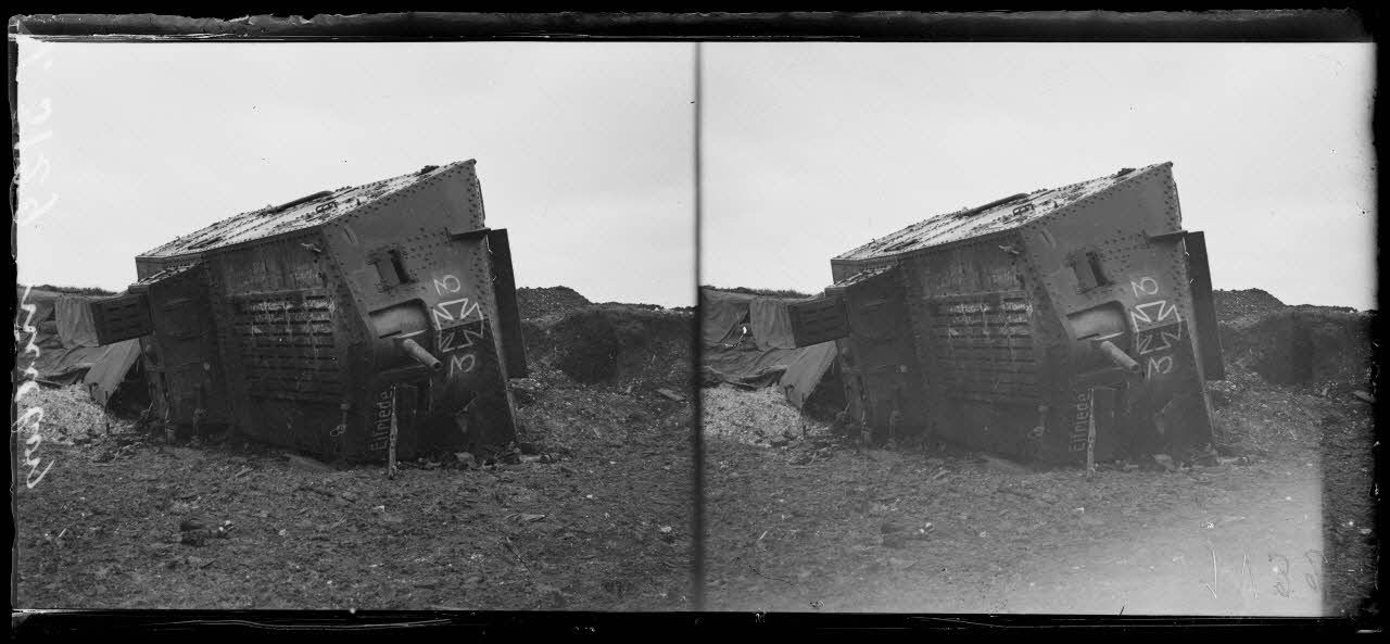 Est de Villers-Bretonneux, Somme, tank allemand renversé dans une carrière, balles perforantes françaises ayant traversé les aillières. [légende d'origine]