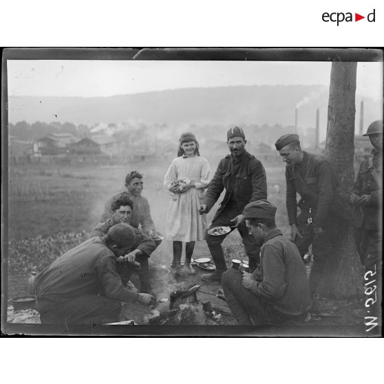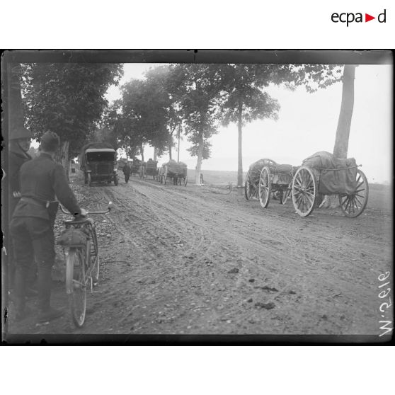 - Le campement d'artilleurs américain sur la route reliant Pompey à Marbache. Des enfants des villages voisins viennent discuter avec les soldats américains. Le convoi de chariots de ravitaillement est stoppé sur le bord de la route ;