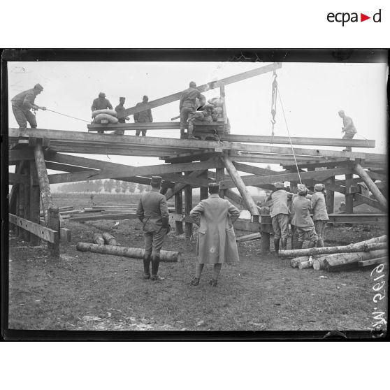 Cusitnes, construction d'un pont sur la Moselle, vue d'ensemble des travaux.