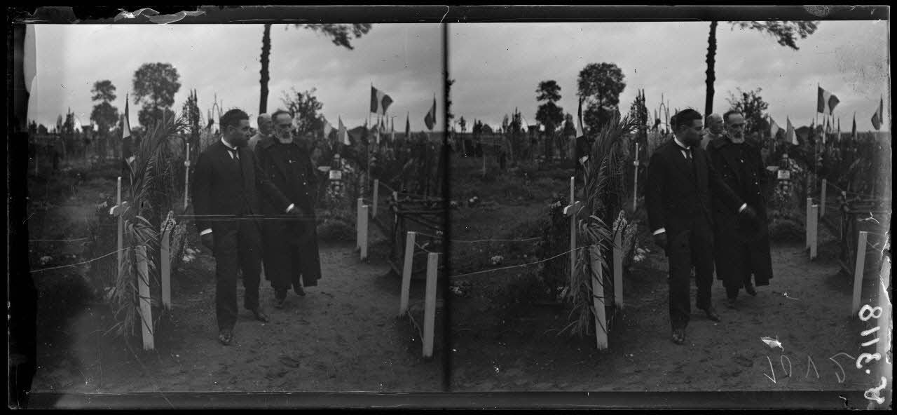 Etrepilly, Seine-et-Marne, anniversaire de la Marne. M. Dumesnil parcourt le cimetière. [légende d'origine]