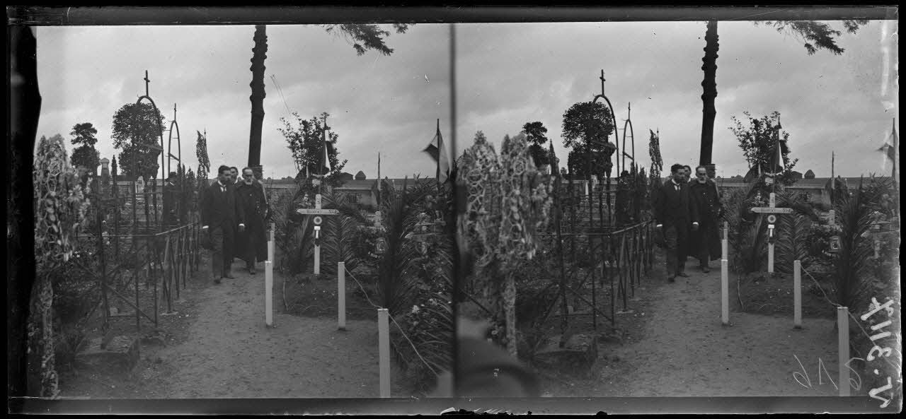 Etrepilly, Seine-et-Marne, anniversaire de la Marne. M. Dumesnil parcourt le cimetière. [légende d'origine]