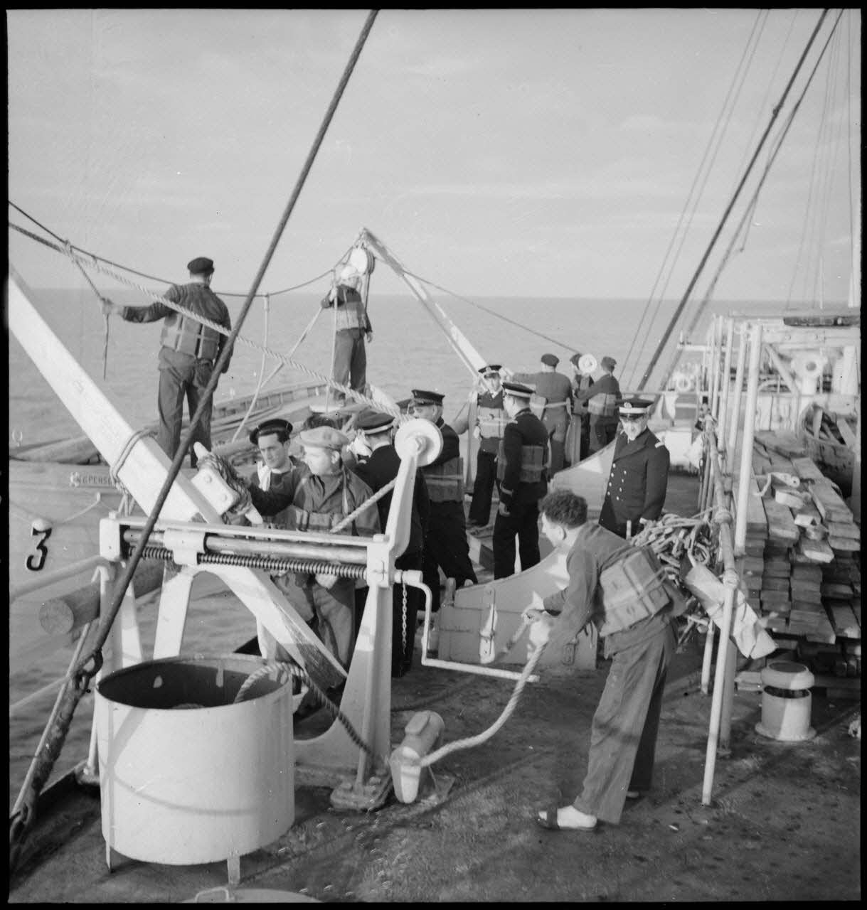 Exercice d'évacuation de l'équipage avec mise à l'eau des chaloupes à bord du cargo réquisitionné Yang Tsé.