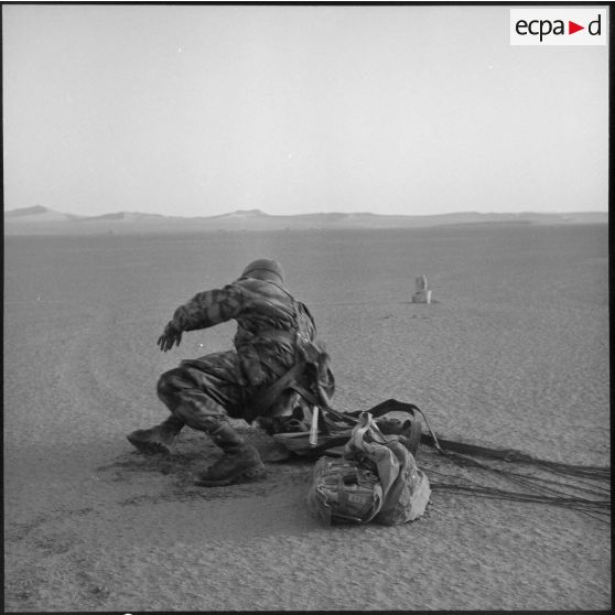 Exercice de parachutage au Sahara de la 1re CSPL (compagnie saharienne portée de la légion étrangère).