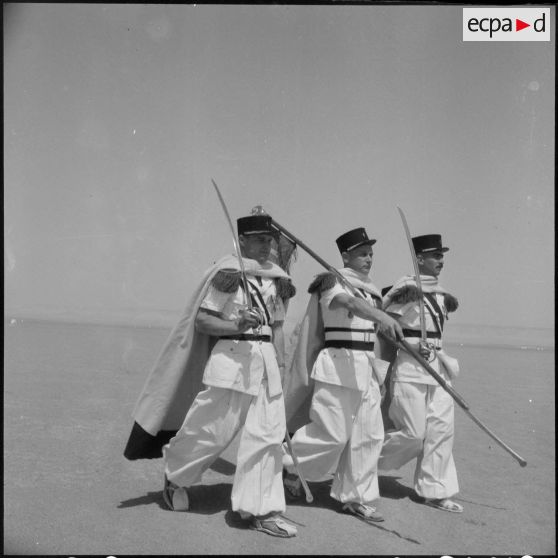 Autorités militaires de la 1re compagnie saharienne portée de la Légion étrangère (CSPL) observant un exercice parachutiste à Ghadames.