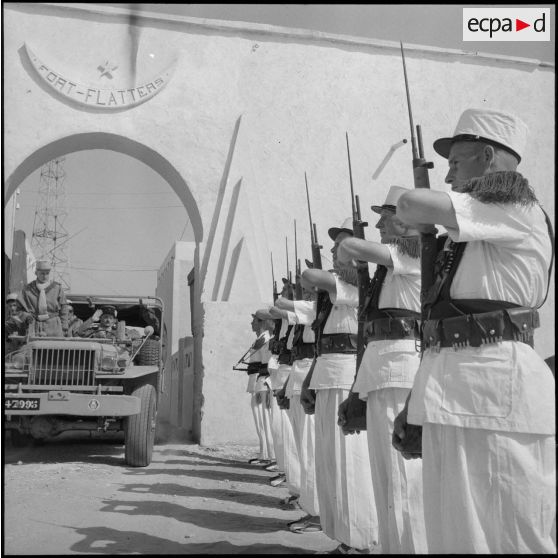 Salut du général Massu aux troupes de la 1re compagnie saharienne portée de la Légion Etrangère (CSPL)à Fort Flatters (Bordj Omar Driss).