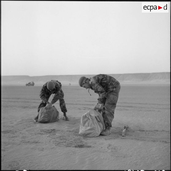 Moniteurs parachutistes de la 1re compagnie saharienne portée de la Légion étrangère (CSPL) lors d'un exercice près de Fort Flatters (Bordj Omar Driss).