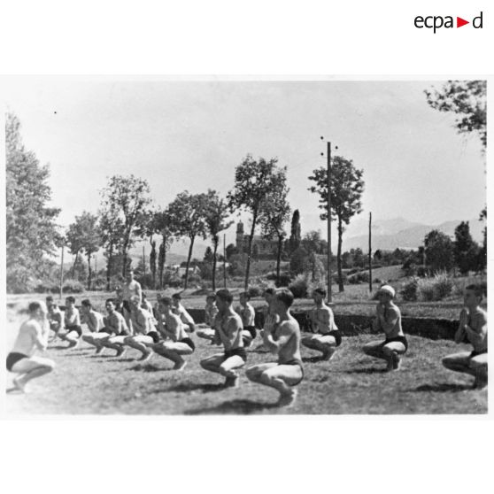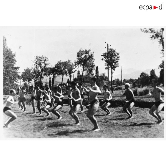 L'instruction militaire et sportive (IMS) dans l'armée d'armistice : instruction et entraînement au franchissement d'un cours d'eau, mouvements de gymnastique, entraînement au lancer du poids et entraînement à l'escalade en montagne.
