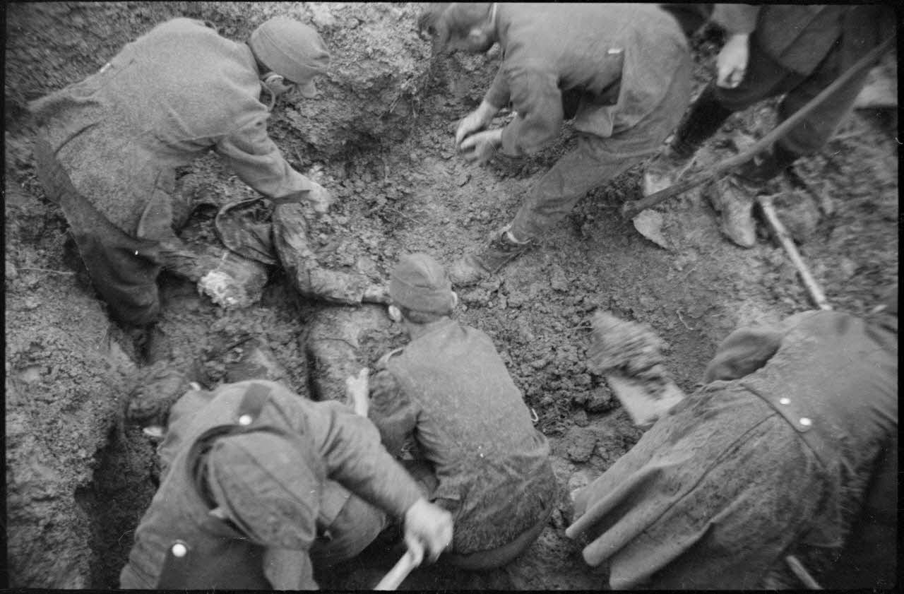 Des prisonniers allemands sont réquisitionnés pour procéder à l'exhumation de corps de résistants FFI (Forces françaises de l'intérieur) du maquis de Magny Danigon fusillés par les occupants allemands le 18 septembre 1944 et exhumés le 1er octobre 1944. Ils sont chargés également de nettoyer une camionnette " Presse cinéma " du Service cinématographique de l'armée.