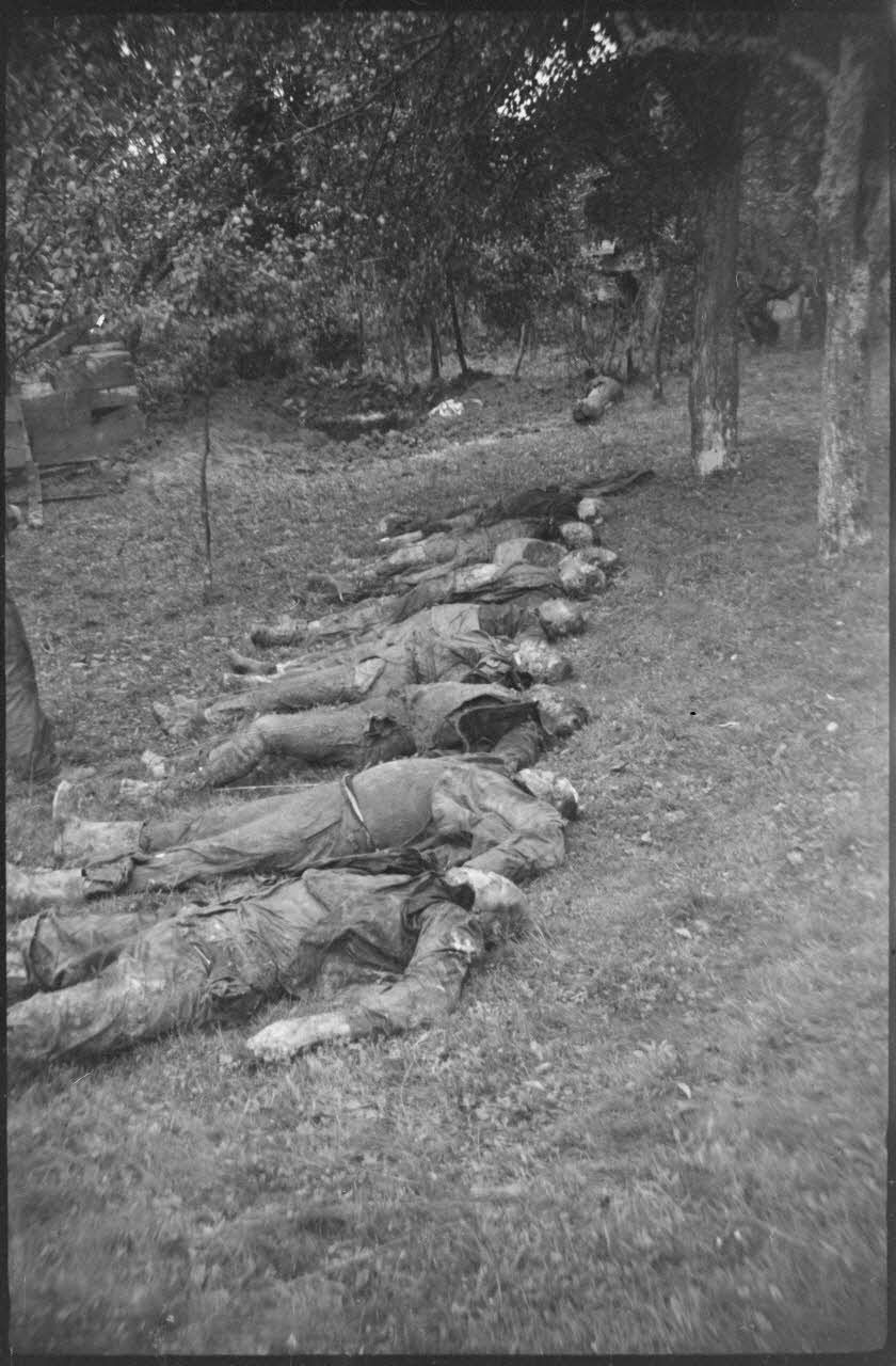 Des prisonniers allemands sont réquisitionnés pour procéder à l'exhumation de corps de résistants FFI (Forces françaises de l'intérieur) du maquis de Magny Danigon fusillés par les occupants allemands le 18 septembre 1944 et exhumés le 1er octobre 1944. Ils sont chargés également de nettoyer une camionnette " Presse cinéma " du Service cinématographique de l'armée.