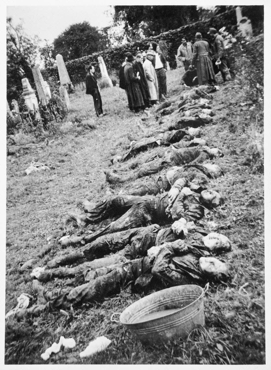 Cadavres de résistants FFI (Forces françaises de l'intérieur) du maquis de Magny Danigon fusillés par les occupants allemands. Après leur exhumation d'une fosse commune par des prisonniers allemands, on procède à l'identification.