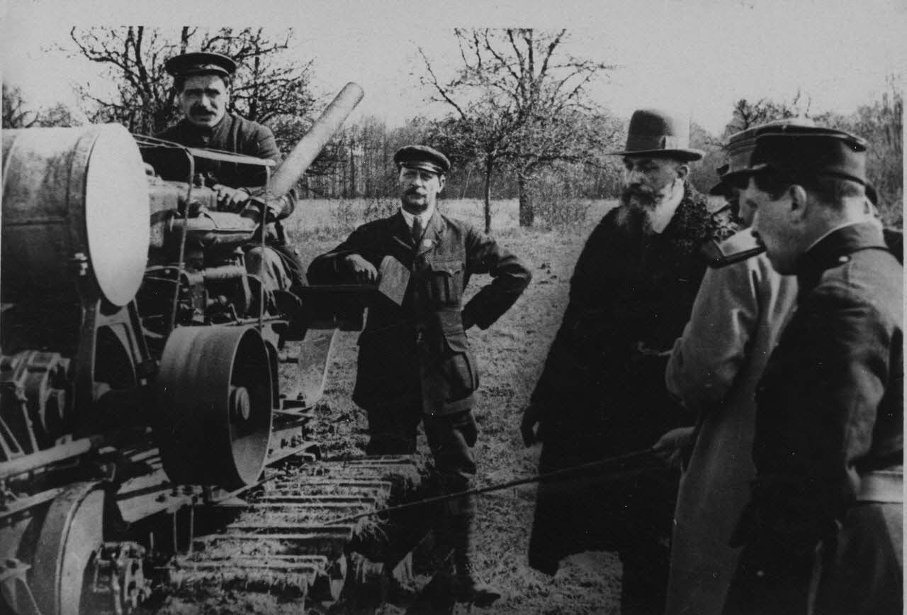 Officiels civils et militaires réunis sur un terrain d'essai pour étudier un projet de véhicule chenillé.