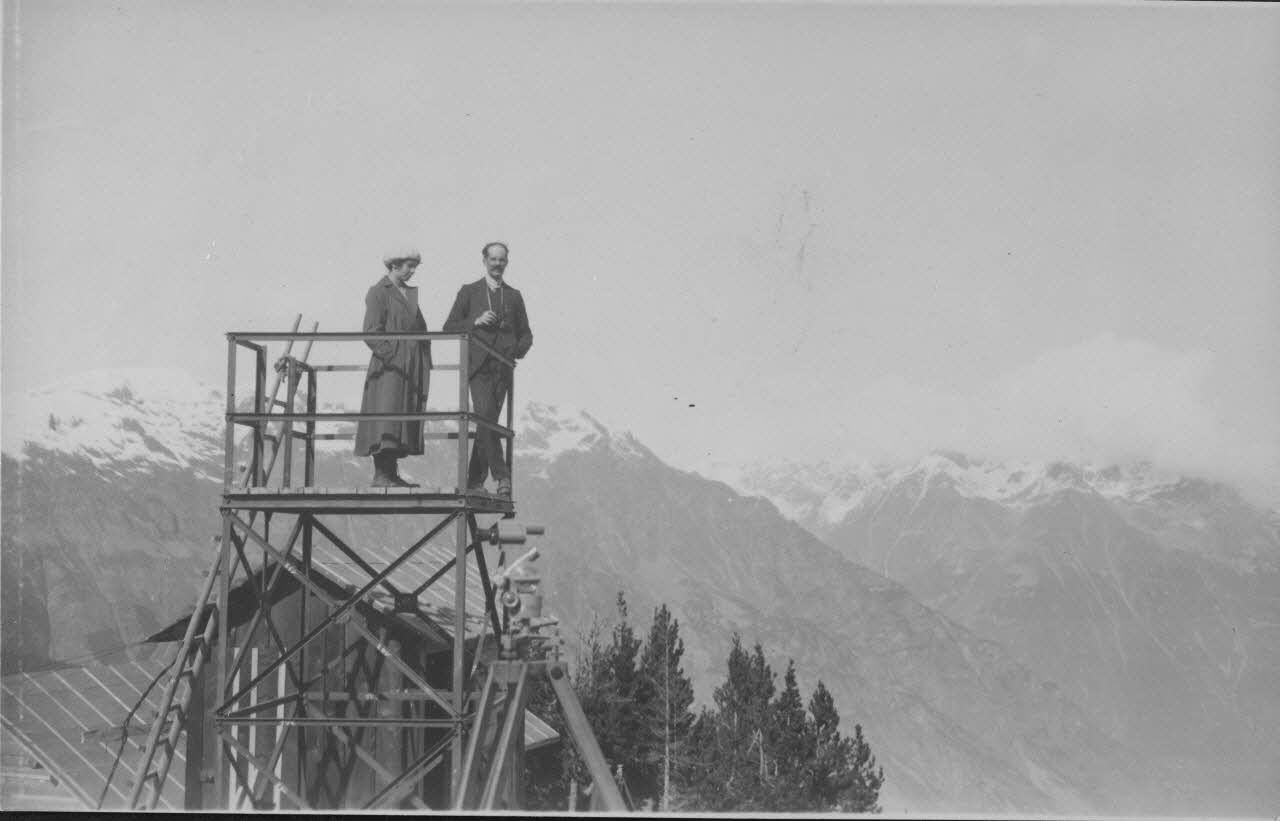 Un homme muni de jumelles et une femme sont installés sur le pylône d'observation au sommet de Prégentil. Au premier plan un instrument de mesure scientifique.
