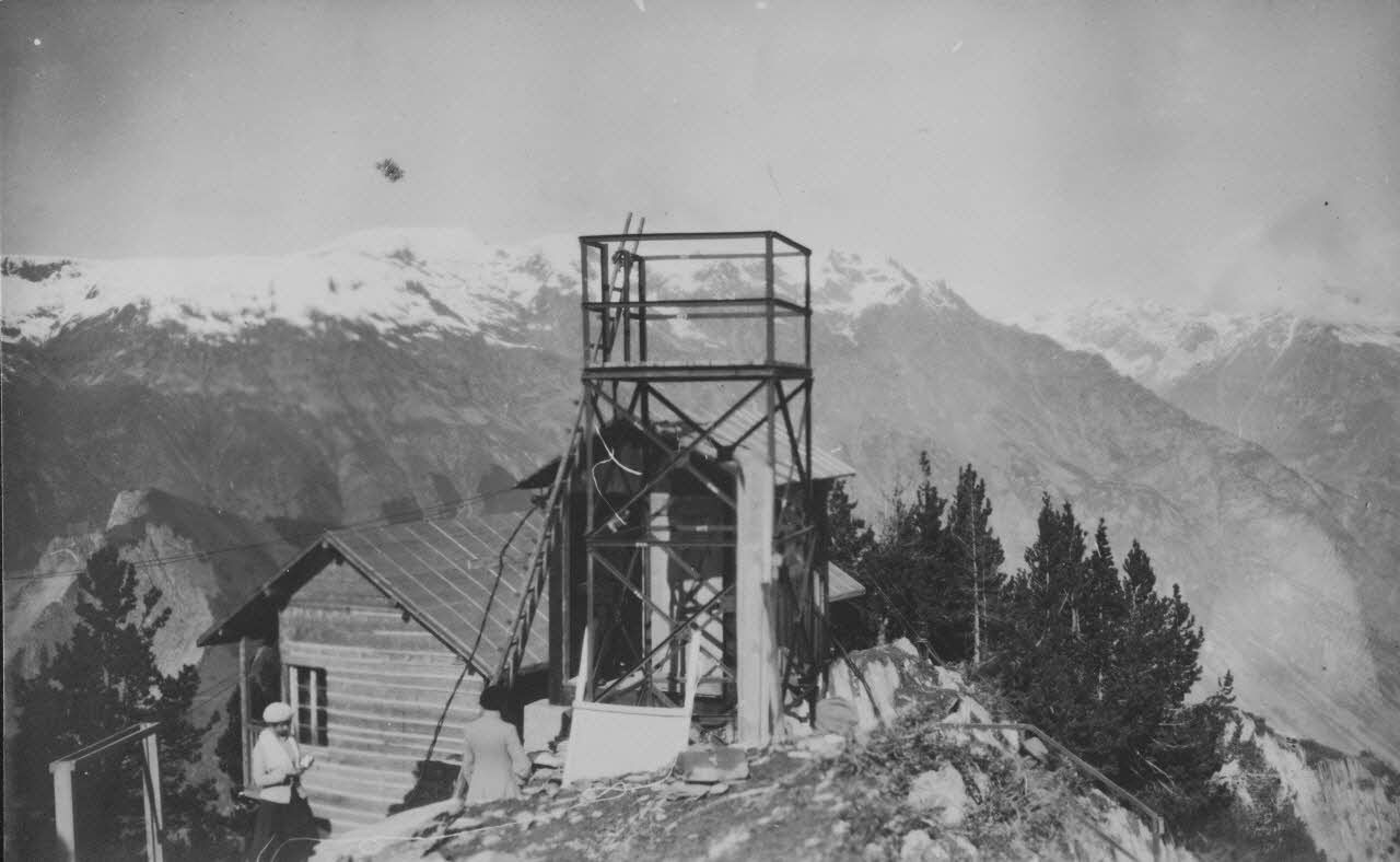 Point d'observation de la section d'expériences de tir en montagne au sommet de Prégentil. Promontoire métallique et châlet.