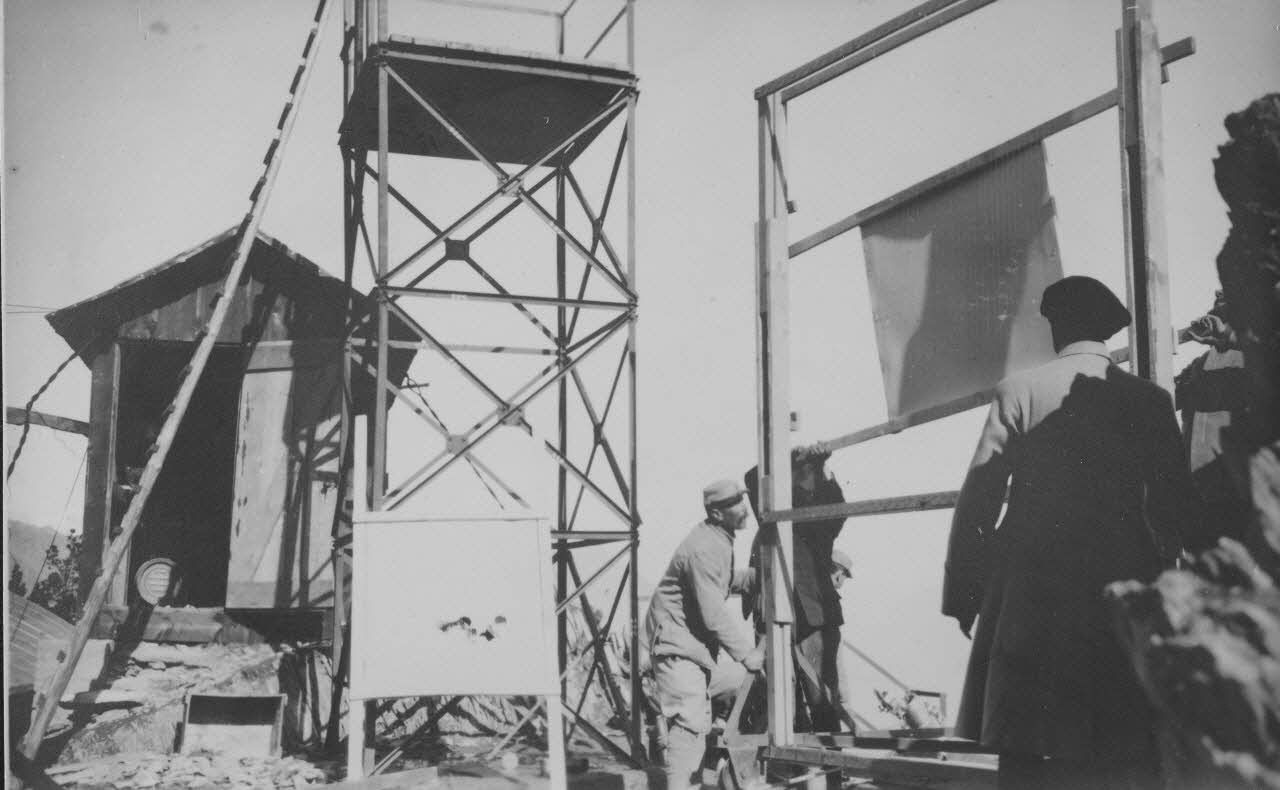 [Expérimentations de tir au sommet de Prégentil (Oisans). Pylone et cadre cible, 1918.]