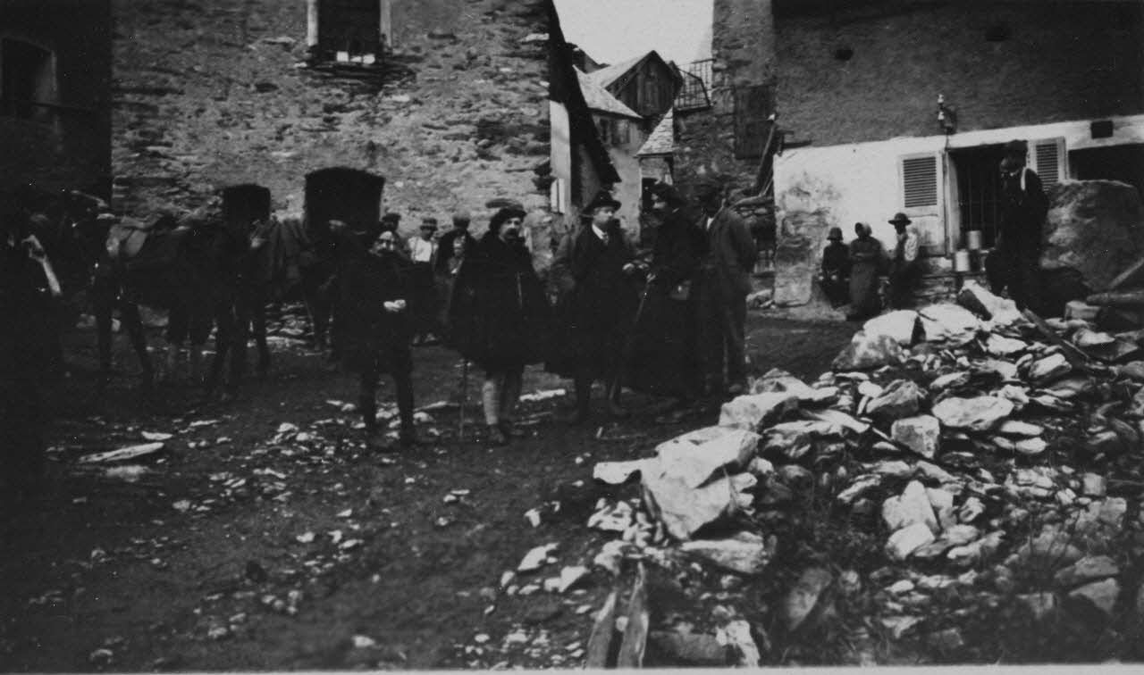 A l'occasion des expérimentations de tir dans l'Oisans, le groupe constitué de scientifique et d'officiels dont Jules-Louis Breton et Paul Helbronner fait une halte à Villard Reymond, petit village à 1650 m d'altitude.