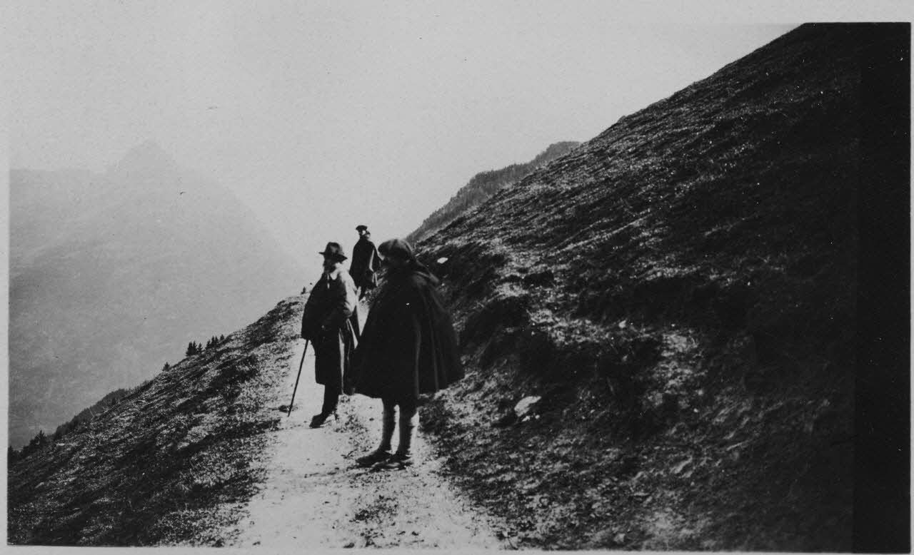 Jules-Louis Breton et deux membres de la Section des expériences de tir en montagne s'arrêtent pour regarder le paysage sur un chemin de montagne.