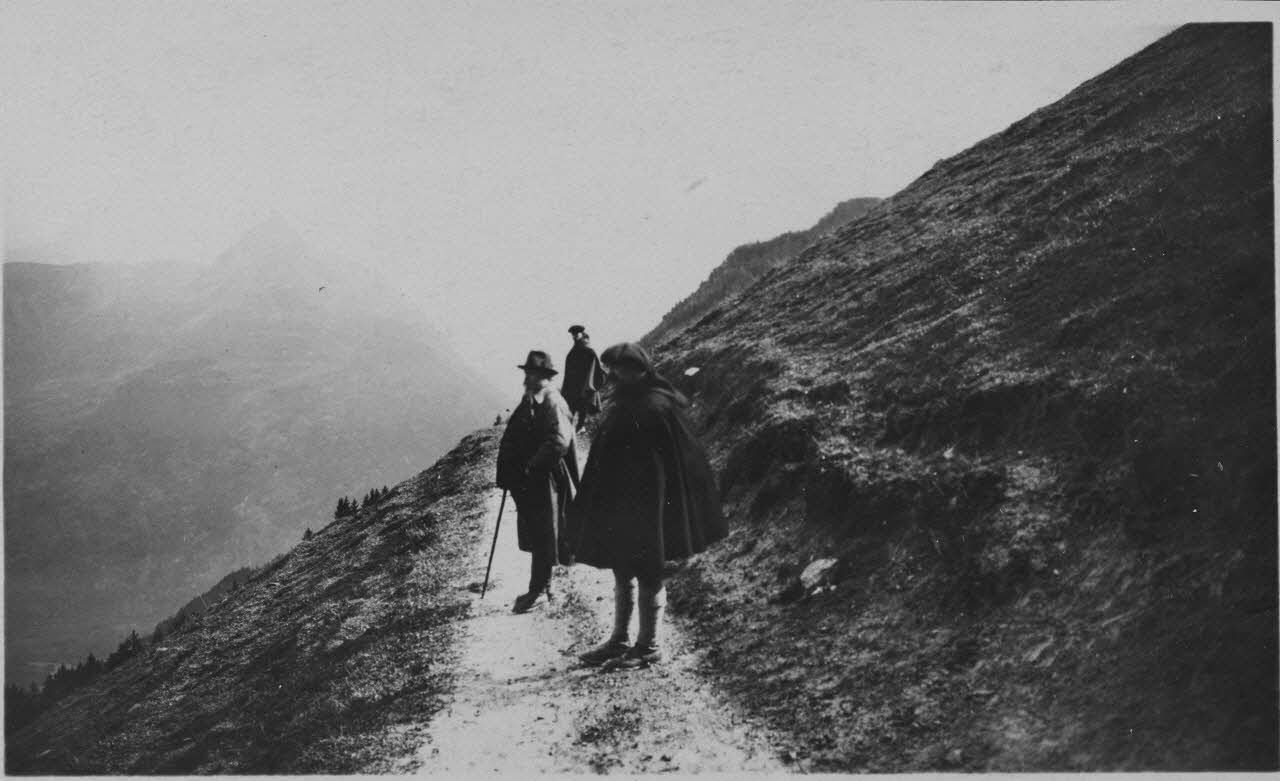 Jules-Louis Breton et deux hommes de la section d'expériences de tir en montagne sur un chemin de montagne à l'occasion des expérimentations dans l'Oisans.