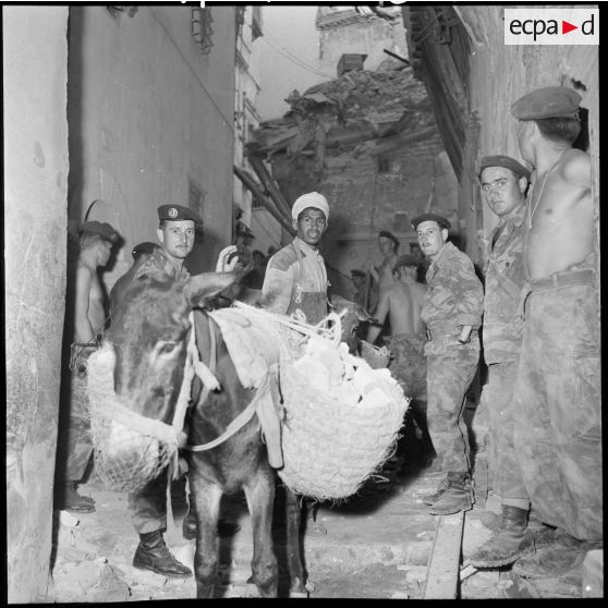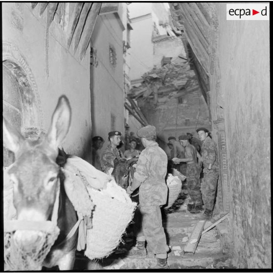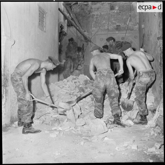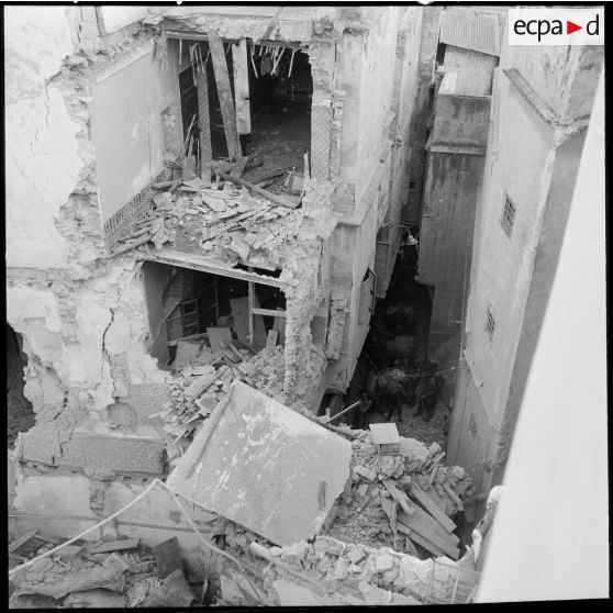 Explosion à la casbah d'Alger. Soldats déblayant les débris des immeubles.