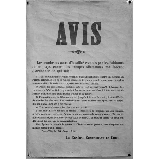 Paris. Musée franco-américain. Métro Leblanc. 6 avenue Malakoff. Affiche. Proclamation aux habitants de St Dié. 17 août 1914.