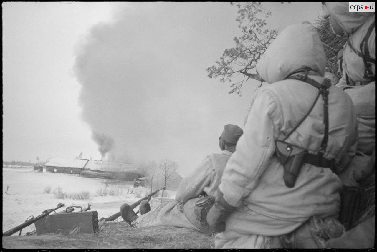 Un Nashorn (Sd.kfz.164) progresse sur une route enneigée. Un Sd.kfz.124 "Wespe" embourbé, a été abandonné par son équipage. Le passage d'un petit pont de bois demande le soutien de fantassins allemands, les camions l'empruntent également avec prudence. Des fantassins allemands progressent lentement sous la couverture des tirs des Nashorn baptisés "Ostpreussen" et "Goliath" (?). Le reporter est monté à bord d'un des canons automoteurs et immortalise les compartiments pour les obus de 8,8 cm pour le canon Pak 41/43 et quelques tirs. Après quelques salves, deux équipages se rassemblent pour fumer. Portraits de fantassins.