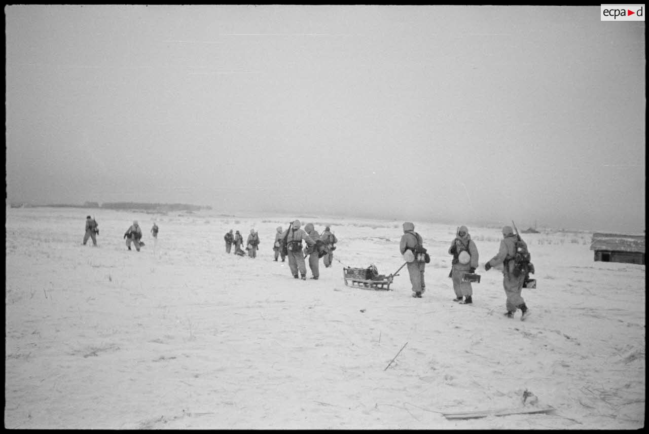 Un Nashorn (Sd.kfz.164) progresse sur une route enneigée. Un Sd.kfz.124 "Wespe" embourbé, a été abandonné par son équipage. Le passage d'un petit pont de bois demande le soutien de fantassins allemands, les camions l'empruntent également avec prudence. Des fantassins allemands progressent lentement sous la couverture des tirs des Nashorn baptisés "Ostpreussen" et "Goliath" (?). Le reporter est monté à bord d'un des canons automoteurs et immortalise les compartiments pour les obus de 8,8 cm pour le canon Pak 41/43 et quelques tirs. Après quelques salves, deux équipages se rassemblent pour fumer. Portraits de fantassins.