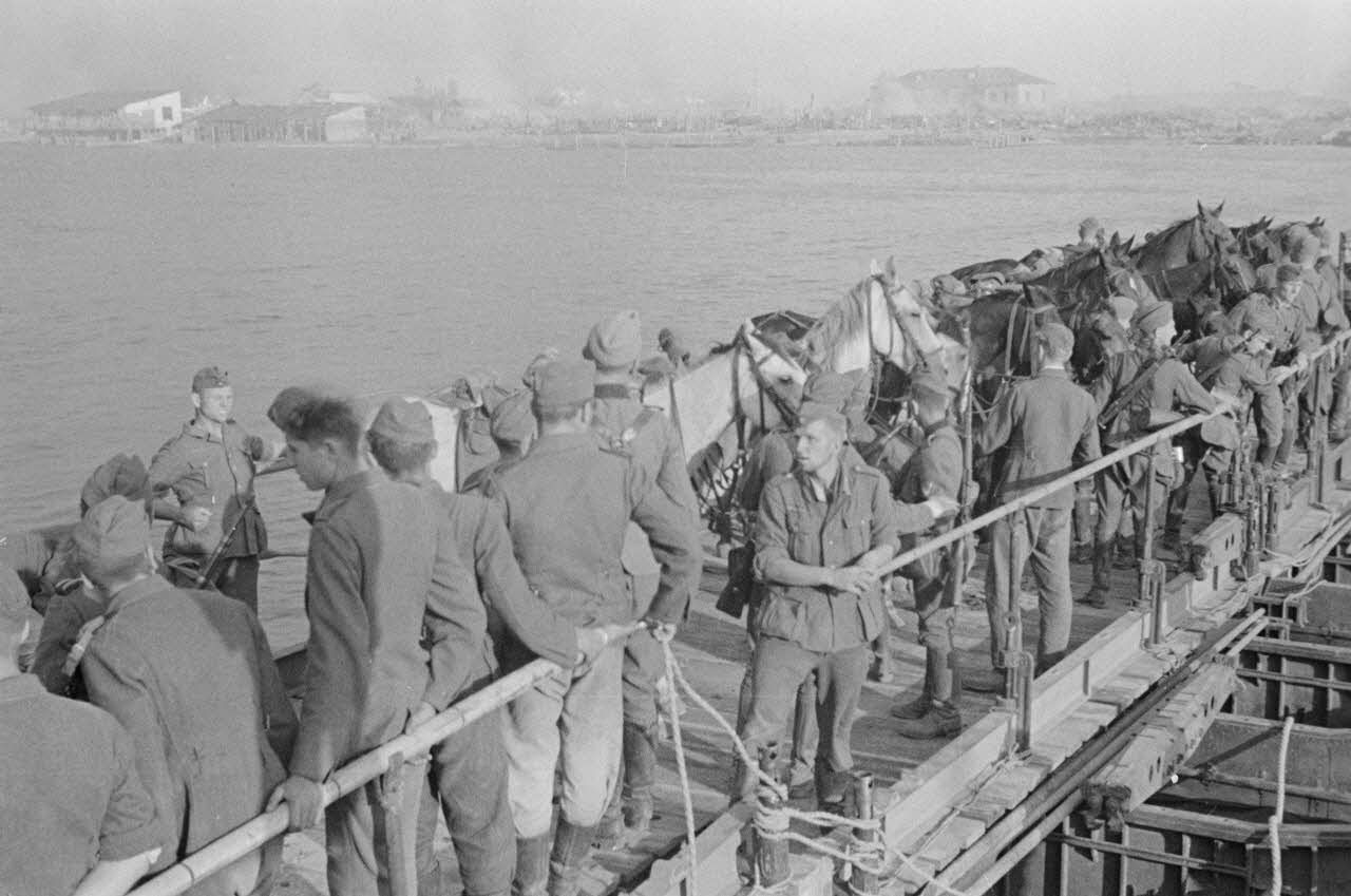 Des soldats et des chevaux traversent le cours d’eau à bord d’une barge.