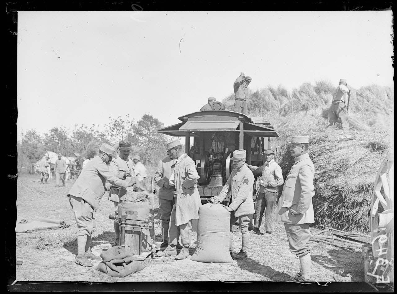 Ferme d'Alger. Marne. Equipe militaire agricole au travail ; le battage du blé et la mise en sac. [légende d'origine]