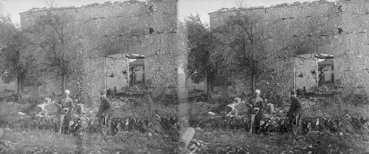 Neuvilly (Meuse). Maisons détruites et maisons avec créneaux .