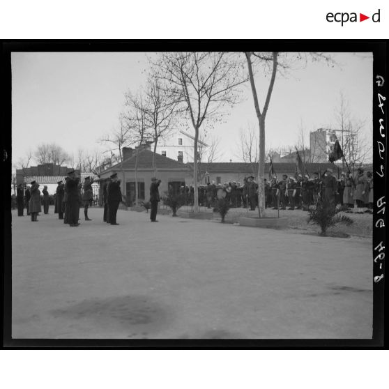Plan d'ensemble sur les personnalités civiles et militaires qui assistent à la fête de la Légion étrangère, dans la cour de la caserne, à Sidi-Bel-Abbès.