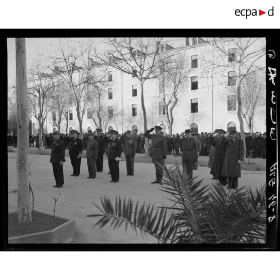 Salut de généraux et officiers de la Légion étrangère dans la cour de la caserne de la Légion à Sidi-Bel-Abbès.