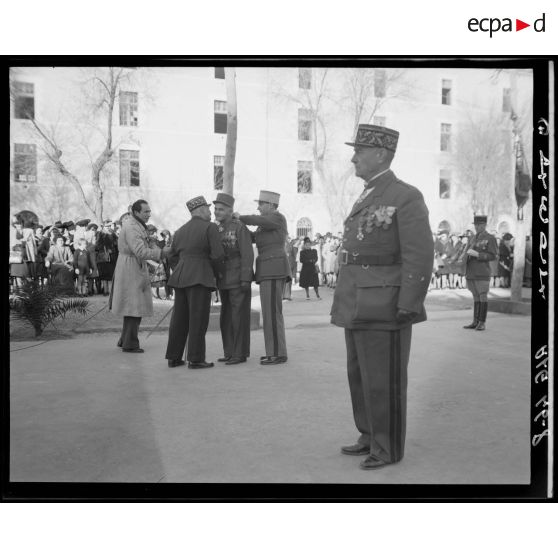 Remise de décoration à une autorité militaire, par le général de corps d'armée Henry Martin.