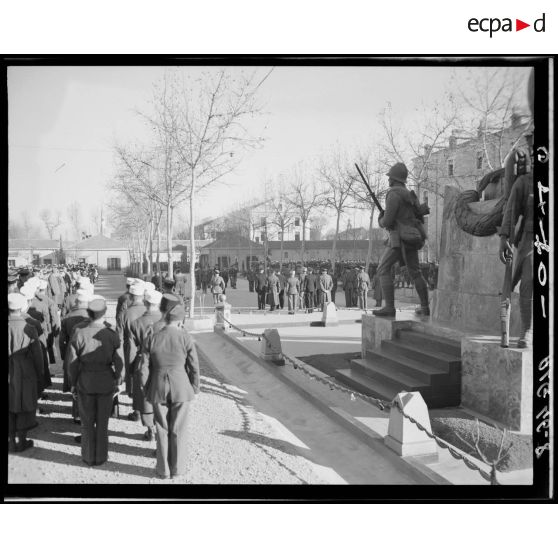 Prise d'armes devant le monument aux morts de la Légion étrangère dans la cour de la caserne de Sidi-Bel-Abbès.