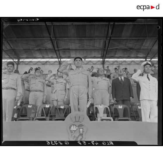 Plan en contre-plongée de la tribune depuis laquelle des autorités civiles et militaires, parmi lesquelles le général Duché, participent à la finale des championnats d'athlétisme, à Alger.