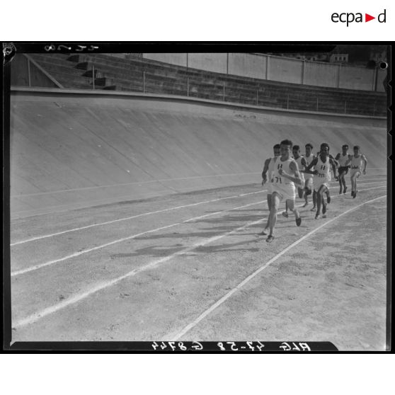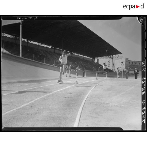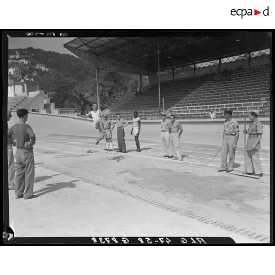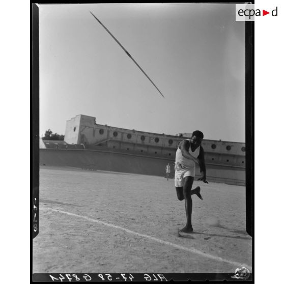 Finale des championnats d'athlétisme à Alger, à laquelle participe le général Duché : épreuves de saut en longueur, de saut à la perche, de lancer du disque, de lancer du javelot, de course de haies, de lancer du poids et de course d'endurance.