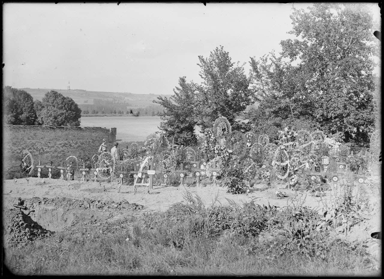 A Fismes, dans la Marne, deux femmes visitent un cimetière militaire où reposent des soldats morts pendant la première bataille de la Marne. De nouvelles sépultures sont en train d'être creusées.