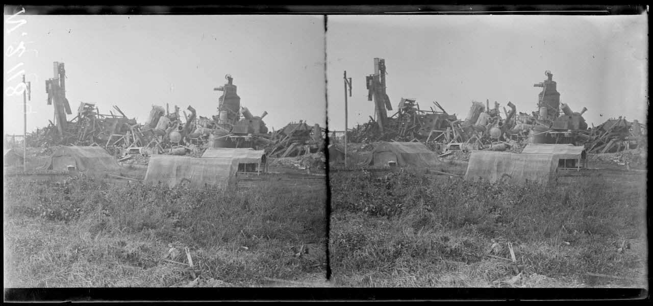 Note : voir film 14.18 B 111 où les images sont légendées de façon imprécise comme étant tantôt les ruines de la distillerie de Séraucourt (localité voisine), tantôt celles de la raffinerie de Flavy-le-Martel. Les vues évoquent effectivement les restes d'une distillerie plutôt que celles d'une scierie.