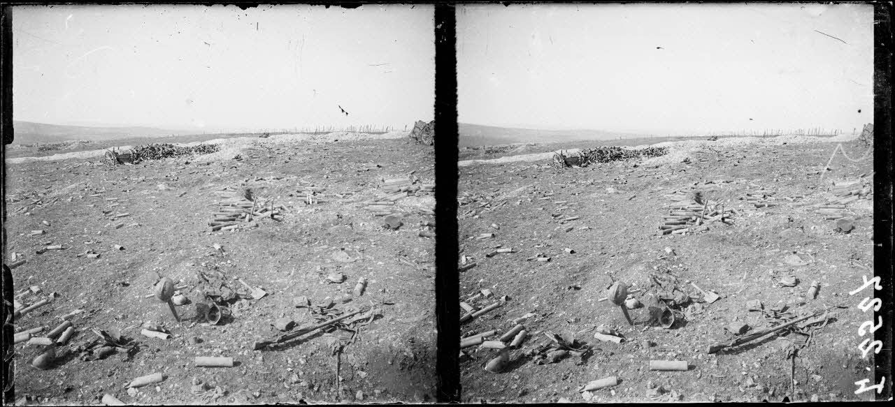 - à Fleury-devant-Douaumont : une batterie de 155 mm (recouverte d'une bâche, SPA 53 L 2523), l'église en ruines au milieu du champ de bataille (SPA 53 L 2525), plan large du champ de bataille (au premier plan un casque Adrian sur une croix marque l'emplacement d'une tombe, autour des douilles d'obus, des pelles et des casques, SPA 53 L 2527), les tranchées au milieu du champ de bataille (SPA 53 L 2528/2530), des soldats sur le champ de bataille (SPA 53 L 2534) ;