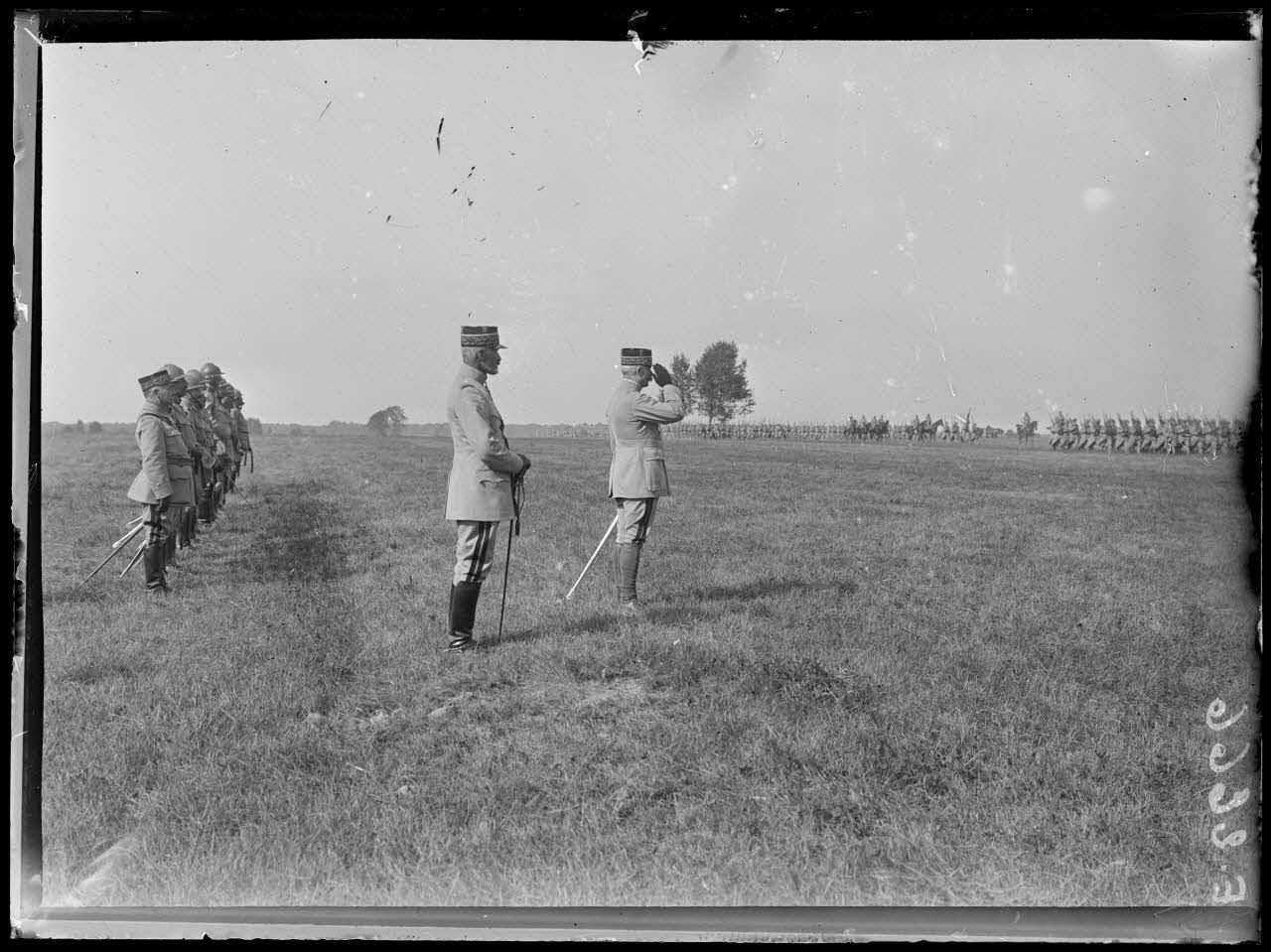 Fleury la Rivière. Marne. Revue de la 14e Division d'infanterie par le général Pétain. Le général Pétain, le général de Bazelaire, à cheval, le général Philipot.